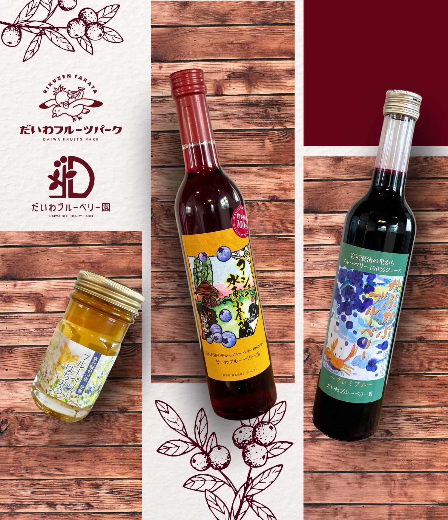 ============= ※この商品にはお酒が含まれます ============= 贈り物にぴったりのブルーベリーワインとブルーベリージュースの2本セットです。化粧箱に入れてお届けします。 *ブルーベリーは”アントシアニン”を多く含み、眼精疲労、動脈硬化、活性酸素などが気になる方にお勧めといわれています。 -------------------- ■ワインについて 岩手県産のブルーベリーを100%使用したワイン。 ブルーベリー特有のさわやかな香りと酸味の調和のとれたやや甘口のワインです。ゴーシュの奏でる「第六交響曲」を聞きながら、くつろぎの一杯をお楽しみください。 【品名】ブルーベリーワイン 『ゴーシュの水車小屋で』/商品名・ラベル監修:林風舎 【原材料】ブルーベリー100% 【容量】500ml 【産地】岩手県 【製造者】株式会社エーデルワイン 【アルコール】9.5% -------------------- ■ジュースについて 当社にて有機栽培のブルーベリーを100%使用した濃厚なジュース。 ブルーベリーの甘酸っぱさがお口いっぱいに広がる、さわやかなジュースです。お好みで、炭酸水等で薄めてお召し上がりください。親子で「かぷかぷ」を飲みながら、今日のできごとをお話ください。 【品名】ブルーベリージュース『かぷかぷブルーベリー』(宮沢賢治作「やまなし」より引用)/商品名・ラベル監修:林風舎 【原材料】ブルーベリー100% 【容量】500ml 【産地】岩手県花巻市 【賞味期限】未開封時約1年 【添加物・保存料】不使用 -------------------- ※お支払い確定後7営業日以内に発送いたします。 ※だいわブルーベリー園からの発送となります。